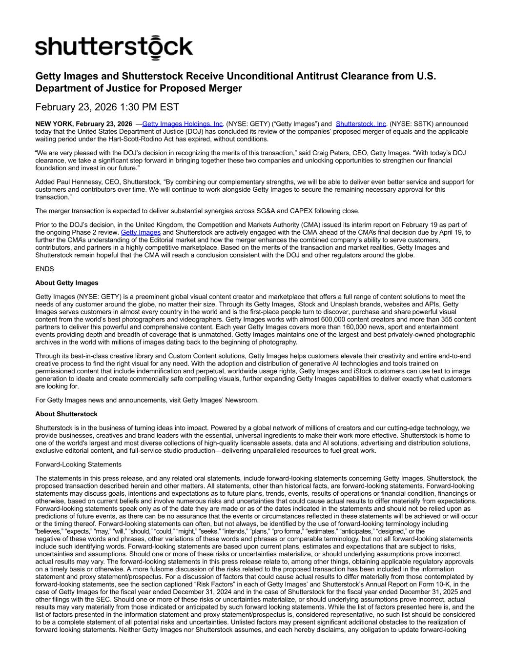 On February 23, 2026, Shutterstock, Inc. (“Shutterstock”) and Getty Images Holdings, Inc. (“Getty Images”) issued a press release (“Press Release”) announcing that the United States Department of Justice (DOJ) concluded its review of the previously announced merger and the applicable waiting period under the Hart-Scott-Rodino Act has expired, without conditions.