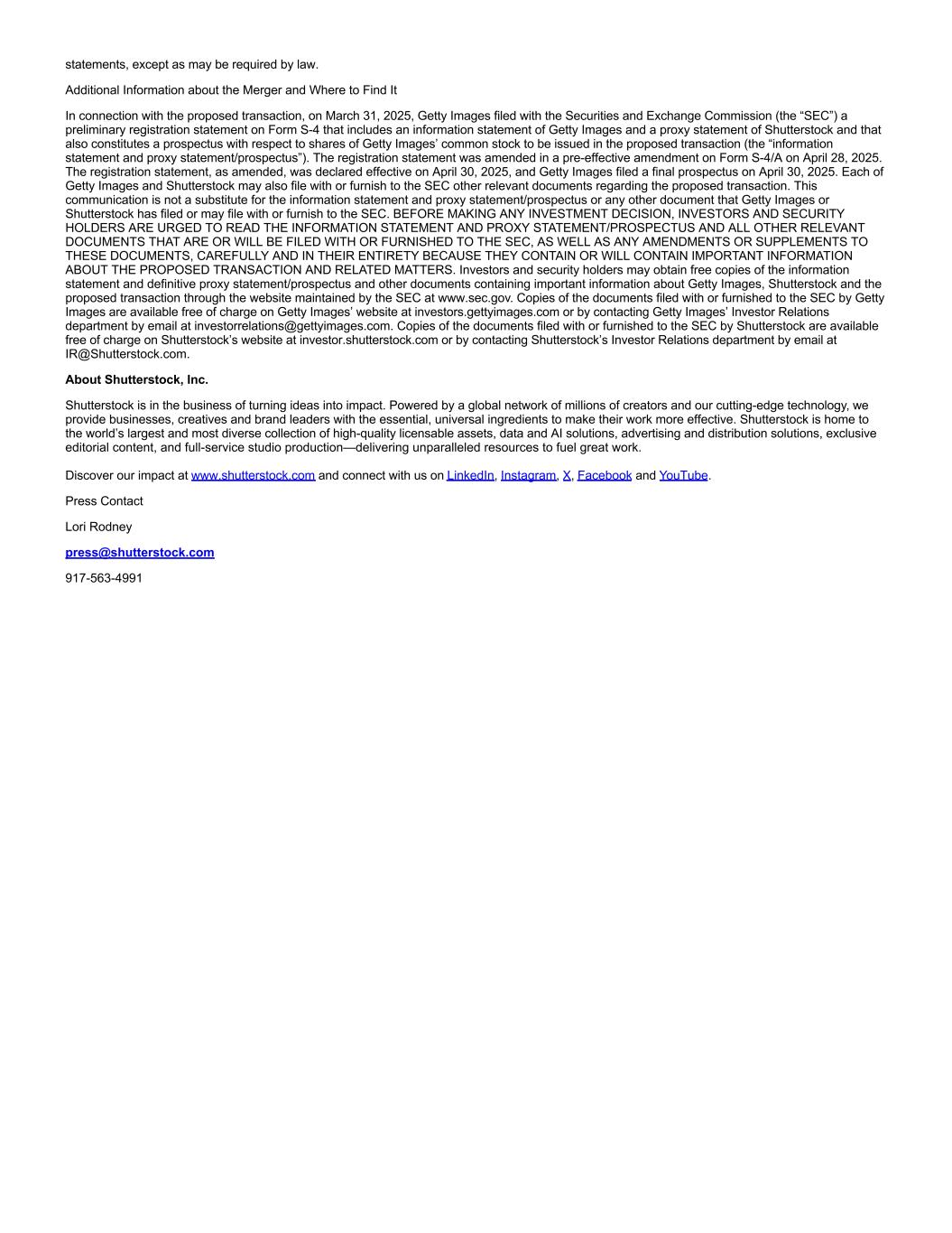 In connection with the proposed transaction, on March 31, 2025, Getty Images filed with the Securities and Exchange Commission (the “SEC”) a preliminary registration statement on Form S-4 that includes an information statement of Getty Images and a proxy statement of Shutterstock and that also constitutes a prospectus with respect to shares of Getty Images’ common stock to be issued in the proposed transaction (the “information statement and proxy statement/prospectus”). The registration statement was amended in a pre-effective amendment on Form S-4/A on April 28, 2025. The registration statement, as amended, was declared effective on April 30, 2025, and Getty Images filed a final prospectus on April 30, 2025. Each of Getty Images and Shutterstock may also file with or furnish to the SEC other relevant documents regarding the proposed transaction. This communication is not a substitute for the information statement and proxy statement/prospectus or any other document that Getty Images or Shutterstock has filed or may file with or furnish to the SEC. BEFORE MAKING ANY VOTING OR INVESTMENT DECISION, INVESTORS AND SECURITY HOLDERS ARE URGED TO READ THE INFORMATION STATEMENT AND PROXY STATEMENT/PROSPECTUS AND ALL OTHER RELEVANT DOCUMENTS THAT ARE OR WILL BE FILED WITH OR FURNISHED TO THE SEC, AS WELL AS ANY AMENDMENTS OR SUPPLEMENTS TO THESE DOCUMENTS, CAREFULLY AND IN THEIR ENTIRETY BECAUSE THEY CONTAIN OR WILL CONTAIN IMPORTANT INFORMATION ABOUT THE PROPOSED TRANSACTION AND RELATED MATTERS. Investors and security holders may obtain free copies of the information statement and definitive proxy statement/prospectus and other documents containing important information about Getty Images, Shutterstock and the proposed transaction through the website maintained by the SEC